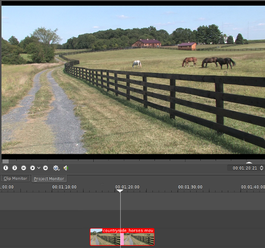 If we're going to mask something out, we need something to fill in the gap we create. In this example, I'm using footage of some horses on a lonely Pennsylvanian farm, so I'll mask out the sky and put in a more exciting time lapse sequence of clouds against a darker blue sky. Whatever you choose to use, import your matte footage or painting into Kdenlive and place it on the bottom video layer of your timeline (Video 3).