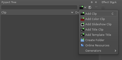 1. If you are starting with an empty Kdenlive project, right-click anywhere in your Project Tree, or use the film icon in top right and select Add Clip.