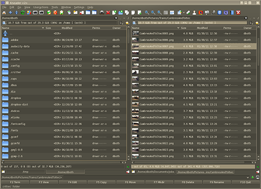Krusader is an exceptional file manager that is modeled after Midnight Commander. It uses a similar two-pane interface, but it's graphical instead of text-based. Krusader provides many features that enhance its functionality as a file manager. Krusader allows you to use the same keyboard navigation and command structure as Midnight Commander, and also allows you to use the mouse or trackball to navigate and perform all of the standard drag and drop operations you would expect on files.