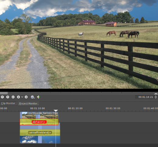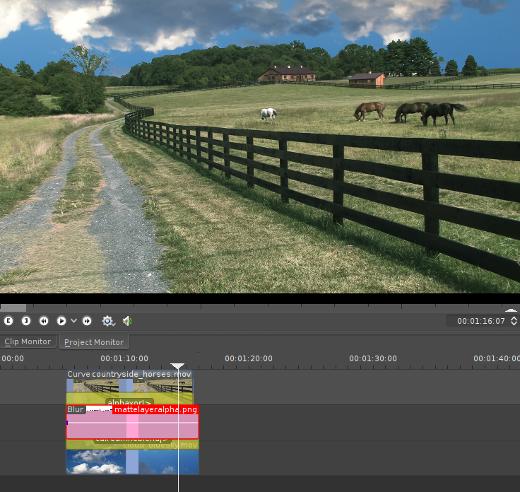 If we're going to mask something out, we need something to fill in the gap we create. In this example, I'm using footage of some horses on a lonely Pennsylvanian farm, so I'll mask out the sky and put in a more exciting time lapse sequence of clouds against a darker blue sky. Whatever you choose to use, import your matte footage or painting into Kdenlive and place it on the bottom video layer of your timeline (Video 3).