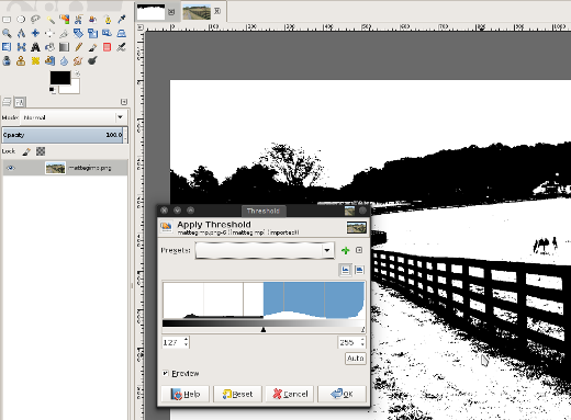 Once the threshold filter has been applied, I use Select > By Color to grab just the sky, then Select > Invert to select everything but the sky.