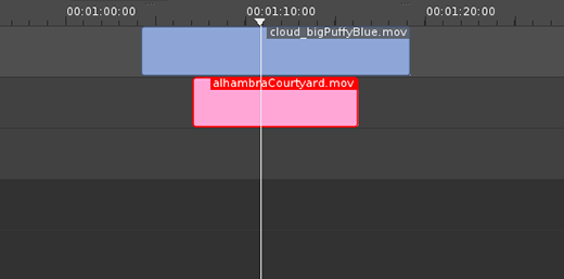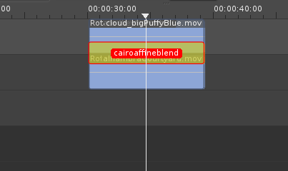 3. The clips now occupy the same space at the same time, but we need to override Kdenlive's (quite sensible) default of only showing the topmost layer by adding compositing.