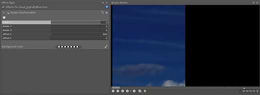 In the Rotate effects panel, there are sliders to rotate the image along the X, Y, and Z axes, but ignore those. Instead, use the Offset values to shift the video to either the right or left side of the frame. Don't panic: you won't be able to see the bottom clip yet. That's normal.
