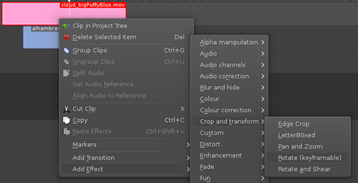 Right-click on the top video clip and select Add Effect > Crop and Transform > Rotate (keyframable).