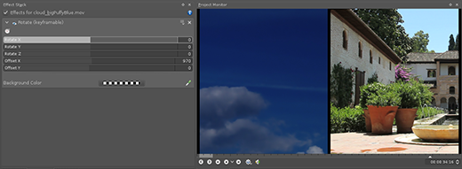 5. Use the Rotate panel of each clip to make fine adjustments to their alignment. For example, extend the offset so that there is a black bar between the two frames.