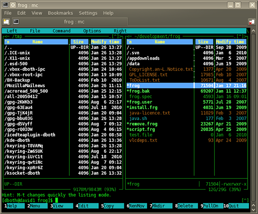 Along the very top of the Midnight Commander interface is a menu bar containing menu items for configuring Midnight Commander, the left and right panes, and for issuing various file commands. The bottom portion of the interface displays information about the file or directory highlighted in each pane, a hint feature and a line of function key labels; you can simply press the function key on your keyboard that corresponds to the function you want to perform. Between the hint line and the function keys is a command line.