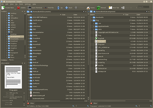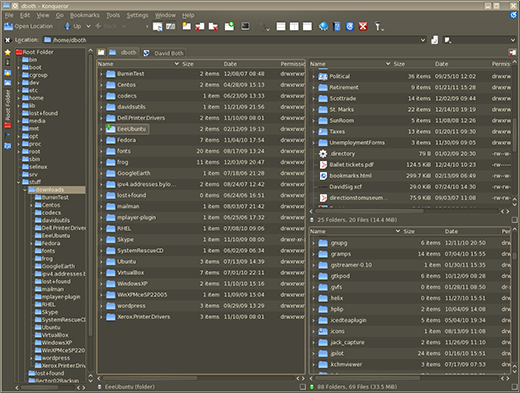 The main thing that sets Konqeuror apart from the crowd is the ability to open multiple tabs, each of which can have one or more directory navigation panes. In the image below, one tab has been divided into three panes; one on the left side and two on the right. The sidebar at the far left is used to provide rapid navigation of the entire filesystem.