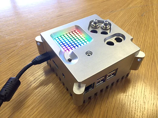 The flight cases will each contain a Raspberry Pi, a Sense HAT, a real-time clock, and a camera module. The Sense HAT is an add-on board for the Pi created especially for the Astro Pi mission by the Foundation's engineering team. It packs an 8x8 full-color LED display; a mini joystick; a set of sensors for temperature, humidity, and pressure; an accelerometer; a gyroscope; and a magnetometer.