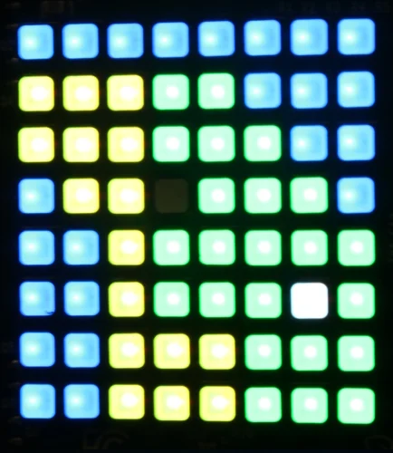 A similar example takes the humidity value and displays a visualization of the humidity percentage by filling the LED grid with green pixels accordingly: