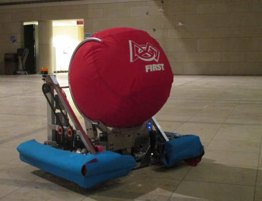 Meet Ellie, a six week old robot weighing 100 lbs who can launch a two foot diameter exercise ball over 10 feet in the air! Ellie even has eyes: a webcam fitted to the front of her chassis that uses code written in Python running on a Raspberry Pi to process images. Ellie’s main code is written in Java and allows her mecanum wheels to drive, her claw to catch exercise balls, and her kicker to launch balls into the air. In just a few weeks Ellie will be competing along with more than 50 other robots in her first competition.