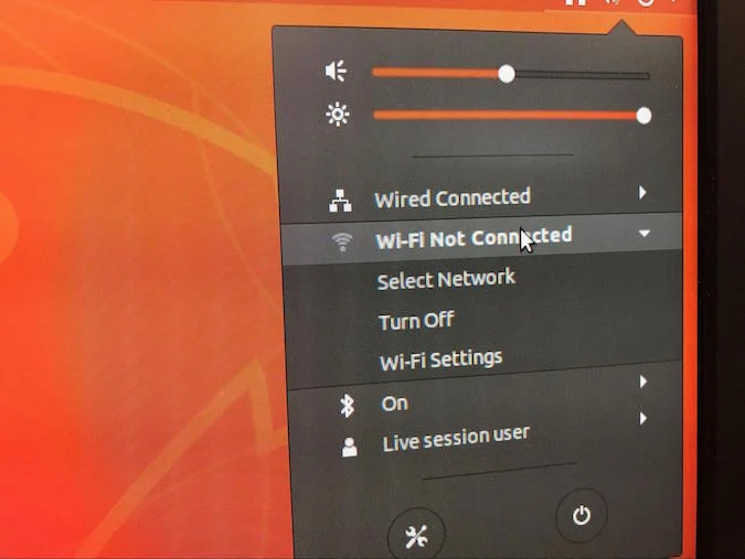 4. Once the computer has booted from USB, I am presented with a "live user" session on the particular Linux distribution I have chosen. Your particular distribution might look slightly different. The first thing I always check is to ensure that I have a wired and/or wireless connection to the network and internet. This particular distribution is a Gnome3 desktop, and those icons are at the top right of my display.