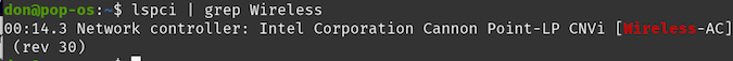 Using this command lets you know who the card manufacturer is and what model it is, which will be important in finding a solution. Similarly, you can easily find the wireless adapter information also using a slightly different command: lspci | grep Wireless.