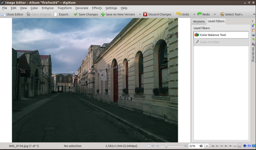 DigiKam has an built-in editor for most common photo effects and touch-ups. To get there, select a photo and click the Image Editor button along the top toolbar. This opens a new window for dedicated editing.